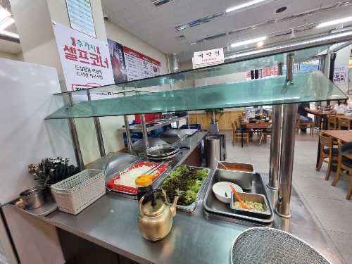 이곳 초벌직화숯불돼지갈비집도 피해 갈 수 없는 셀프코너를 마련해 놓았어요. 테이블도 여유 있는 넓이로 배치를 해서 넓어 보이는 효과도 있네요.
