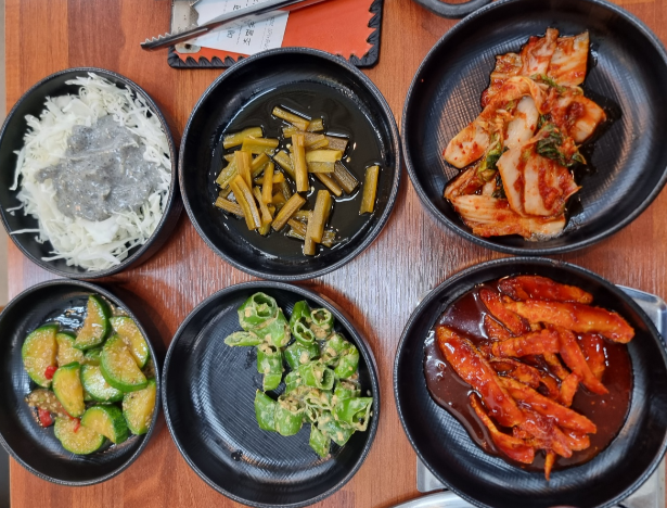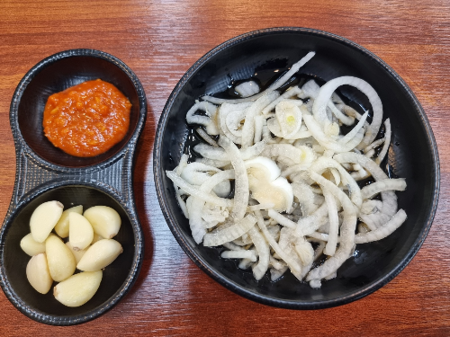 기본 찬으로 나오는 것은 다른 식당들과 비슷한데 더덕이 나왔다는것에 와우를 외치며 손이 가요 손이 가를 외치며 좋아라 했지요. 왜냐하면 더덕을 좋아하니까요. 그리고 개인 접시에 있는 양파는 다른 곳과 같아요.