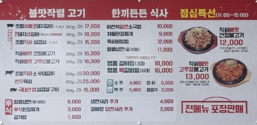불맛작렬고기류와 한끼든든식사도 있고 점심특선메뉴도 있네요. 전 메뉴 포장판매도 한다고 하고 초벌메뉴의 중량은 초벌전 중량입니다.