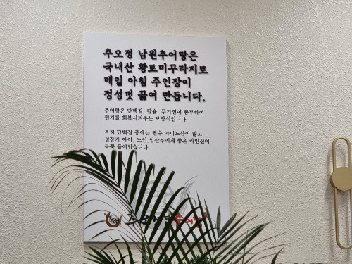 맛나게 드시고 나서 따듯한 커피도 한잔 곁들이려 했는데 용량이 초과되지 않게 마시지는 못 했네요. 그리고 한쪽 벽면에 자리잡은 주인장님의 각오가 있네요. 올 겨울에는 건강에도 좋은 추오정 남원 추어탕 드시고 건행하세요.