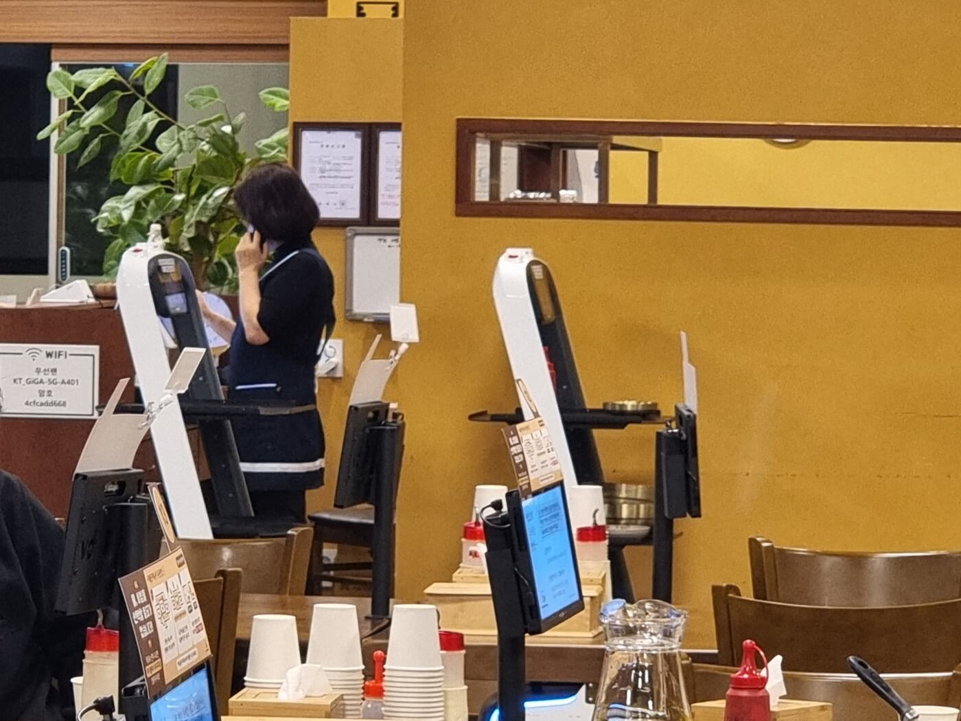 테이블에는 노란 메밀차가 놓여 있고 키오스크도 놓여있어 주문은 쉽게 할 수 있는데 감자옹심이가 먹고 싶어 갔는데 막상 키오스크를 접하니 감자옹심이 메밀칼국수와 옹심이만이 브레이크타임이 끝나고 시작한 지 얼마 되지도 않고 재료소진으로 마감이라니 어이가 없었네요. 기본 재료도 준비가 안 됐나 싶기도 해서 기분이 떨떠름하고요 갈까 말까 하다가 왔으니 뭐라도 먹고 가자 해서 주문을 일단 했네요.