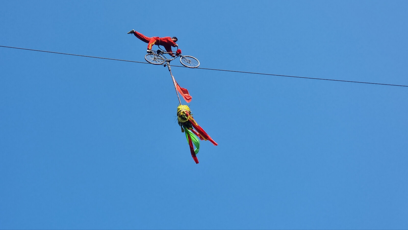 화경지 위에서는 중국음악에 맞춰서 공중 외줄자전거 묘기가 한창입니다. 오고 가는 여행객들에게 멋지고 아슬아슬한 묘기를 보여주니 한참을 서서 고개 들어 보니 또 다른 재미가 있어서 좋네요.