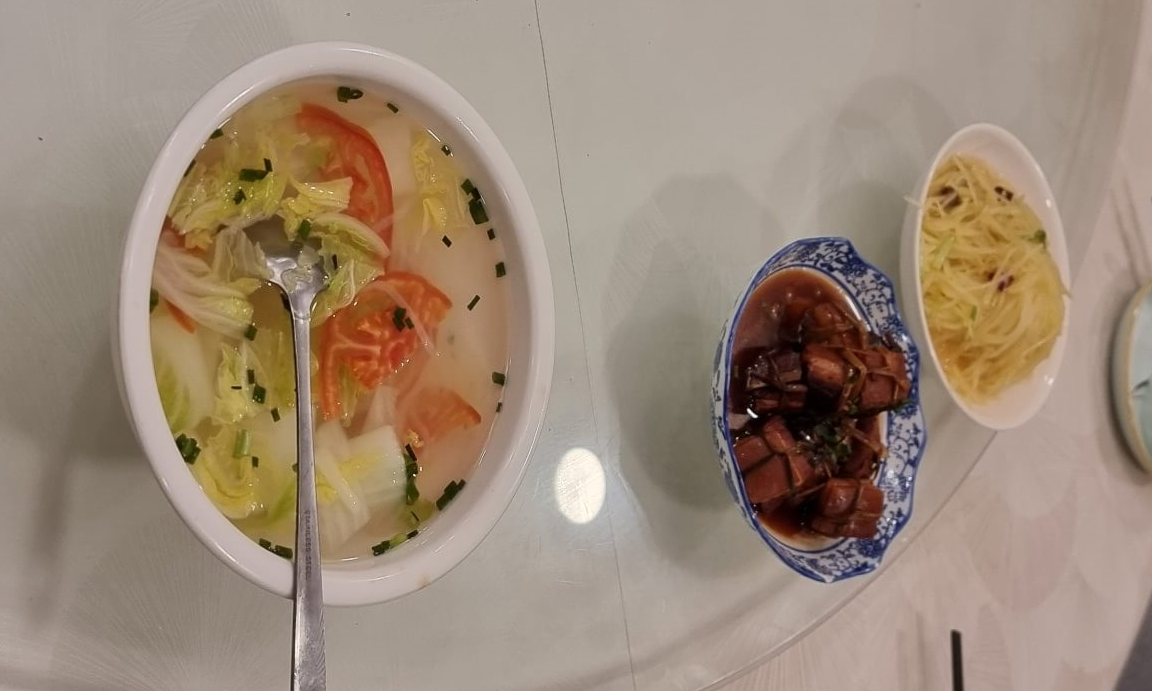 밥은 예전의 우리나라 통일벼 밥맛 같고 한꺼번에 이렇게 듬뿍 퍼다가 개인이 덜어 먹어요. 그리고 요리는 계란 따로 볶고 그다음 고추를 넣어 볶은 것 같아요. 요리 전체적으로 기름이 들어가 볶은 요리이다 보니 대부분 느끼하다고 다들 얘기를 하네요. 항주 여행에는 김이나 볶은 양념고추장이 필요할 것 같아요.