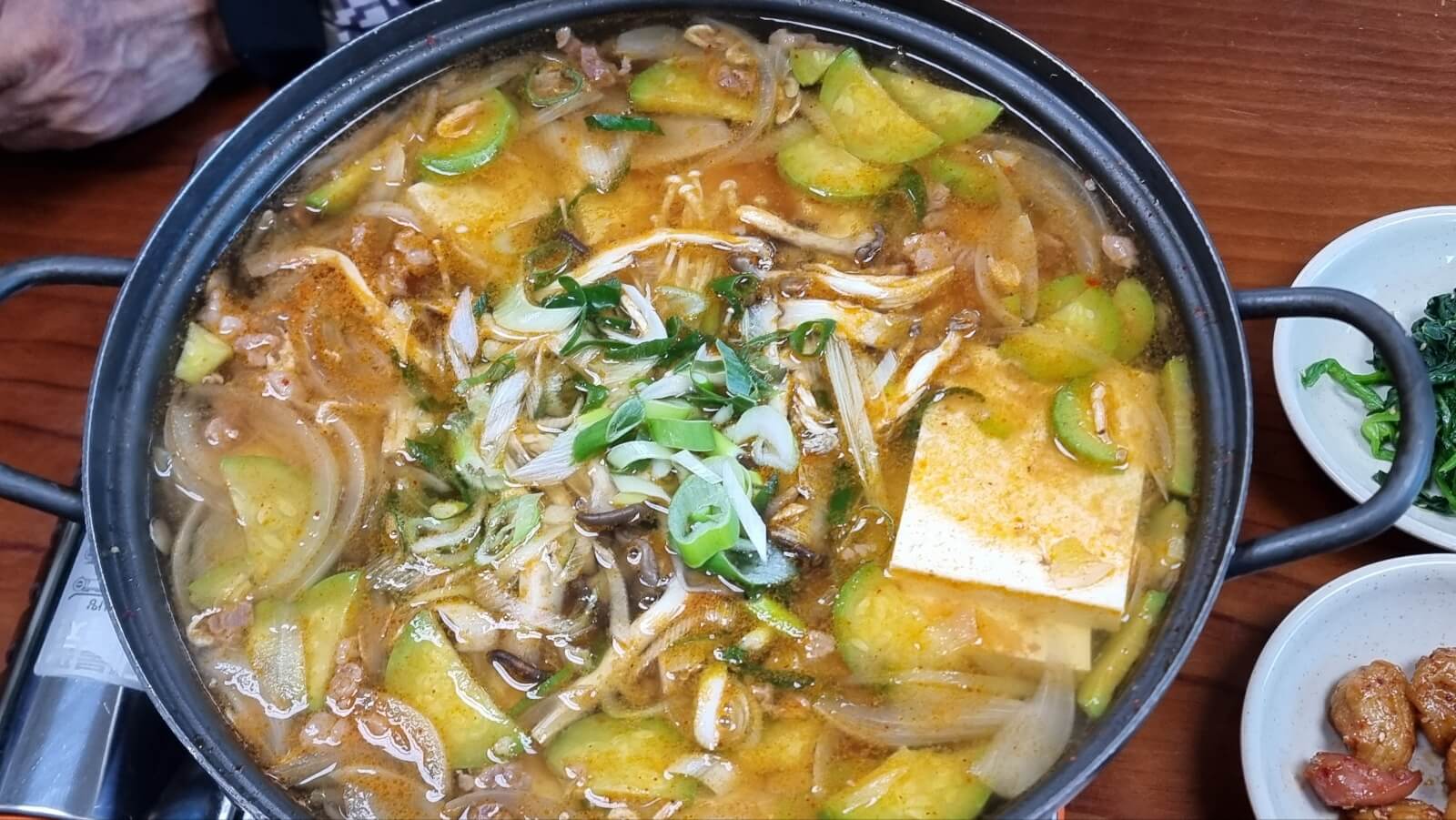 두부전골은 사진에서 보는 바와 같이 양파, 애호박, 표고버섯을 먹기 좋은 크기로 잘라 넣고 모두부도 넣어 새우젓으로 간을 맞추어서 시원하고 부드러워 맛이 좋습니다.