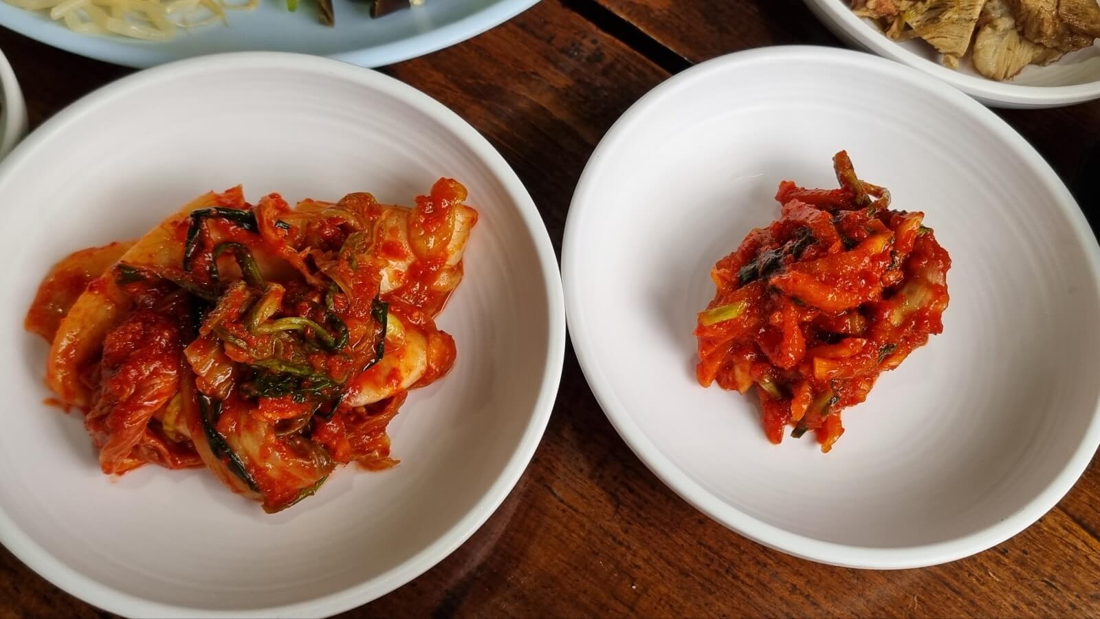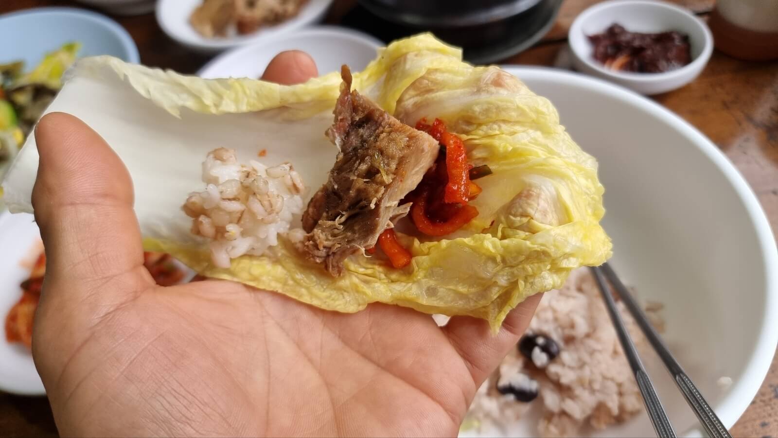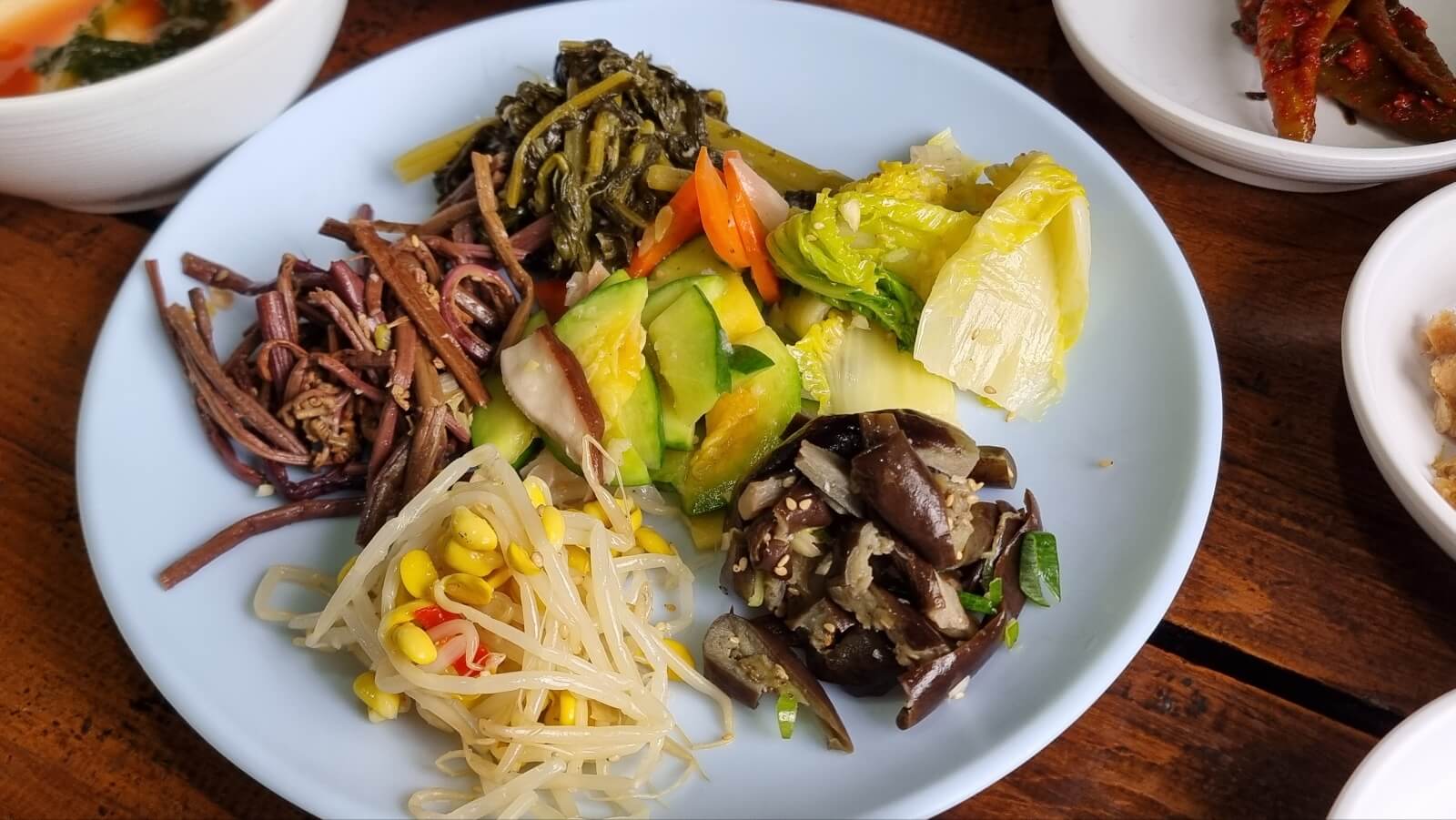 기본적인 나물은 콩나물,가지볶음,애호박볶음,고사리나물, 시래기 무침, 배추 속볶음등 간이 심심하게 배어 있어서 고추장이나 된장과 함께 먹기에 딱 좋은 간입니다.