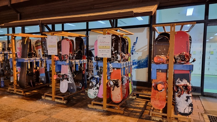 스키보관장소에 즐비하게 늘어선 스키는 주인을 기다리며 가지런히 잘 보관되어 있지요. 보기만 해도 가슴 떨리는 모습에 괜스레 욕심이 생기는 이유는 무언가 모르겠어요.