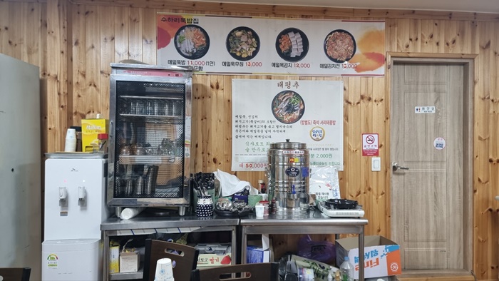 수하리 묵밥집의 차림표는 간단합니다. 메밀묵밥, 메밀묵무침, 태평추입니다. 주문과 동시에 서리태콩 밥을 시작하기 때문에 다소 시간이 걸리더라도 양해부탁드립니다라는 글귀가 차림표아래에 쓰여 있어요. 압력밥솥에서 풍기는 밥맛을 즐기기 위해서는 인내가 필요하지요. 꿀팁은 미리예약을 해서 시간을 맞추면 바로 드실 수 있을 겁니다.