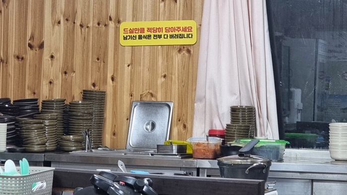 요즘 어느 식당을 가나 보편화되어 있는 셀프코너로 글귀도 비슷비슷하지요. 드실 만큼 적당히 담아주세요. 남기신 음식은 전부 다 버려집니다라고 쓰여 있어서 요리를 먹거나 음식을 먹을 때는 늘 생각하며 먹고 있지요.