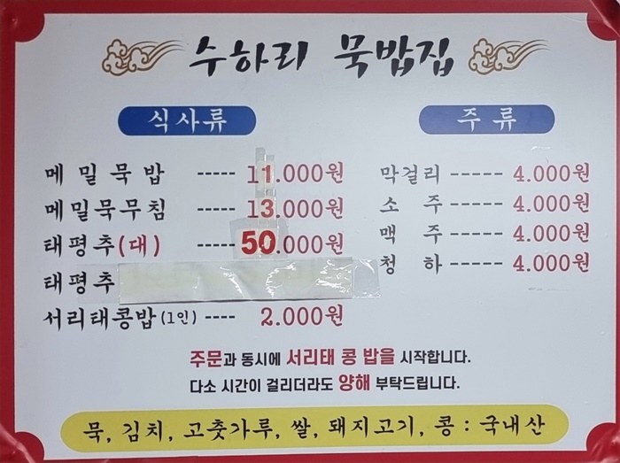 수하리 묵밥집의 차림표는 간단합니다. 메밀묵밥, 메밀묵무침, 태평추입니다. 주문과 동시에 서리태콩 밥을 시작하기 때문에 다소 시간이 걸리더라도 양해부탁드립니다라는 글귀가 차림표아래에 쓰여 있어요. 압력밥솥에서 풍기는 밥맛을 즐기기 위해서는 인내가 필요하지요. 꿀팁은 미리예약을 해서 시간을 맞추면 바로 드실 수 있을 겁니다.