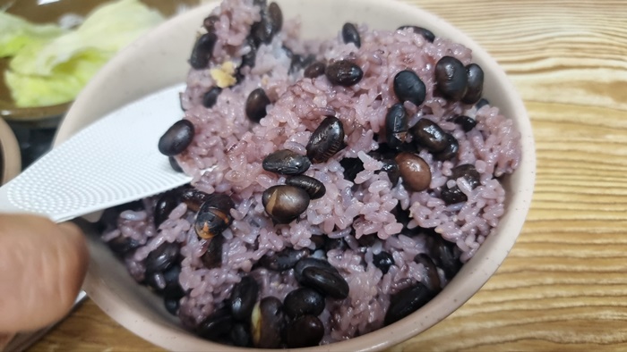 압력밥솥에서 갖지은 서리태 콩밥 맛은 옛 속담에 둘이 먹다가 하나가 죽어도 모른다듯이 주변을 볼 새도 없이 바쁘게 손이 움직이는 만큼 즐거움이 입안 가득 느껴짐을 느낄 것입니다. 처음엔 기대를 하지 말고 드시면 더 큰 입맛을 느끼실 겁니다.