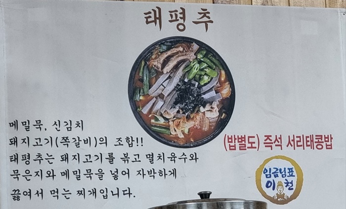 차림표에 태평추라고 쓰여 있어서 도대체 태평추가 뭐지 첨 듣는 요리 같았는데 이렇게 설명을 해 놓았느니 아하 그렇군 하고 알았네요. 메밀묵, 신김치, 돼지고기(쪽갈비)의 조합!! 태평추는 돼지고기를 볶고 멸치육수와 묵은지와 메밀묵을 넣어 자박하게 끓여서 먹는 찌개입니다.