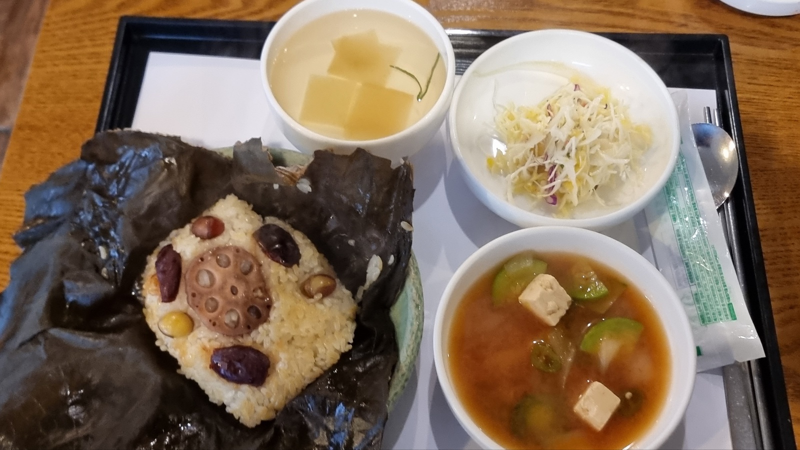 연잎으로 곱게싸서 찌는 것 같아요. 찹쌀밥에 은행, 콩, 연뿌리, 대추등 몸에 좋은 것들로 밥을지어 맛도 건강에도 좋아요.