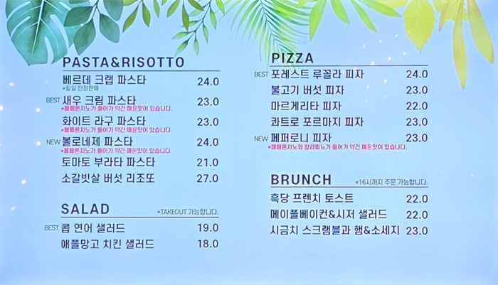 🍀포레스트 아웃팅스의 메뉴는 다양한 브런치와 베이커리 그리고 음료가 많이 있어서 고민거리가 생길 수도 있어요. 무얼 먹을까 베이커리는 무얼 선택할까 무얼 마실까 등등 고민을 하시게 될 거 같아요. 무엇이든 맛나게 드시고 건강하시길 바라 봅니다.