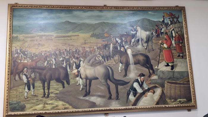 🍀1592년 12월 독산성에서 심리전으로 왜군을 물리친 항전 기록화.왜군은 독산성에 물이 없다는 것을 알고 포위하고 투항을 기다렸으나 권율 도원수가 산정상에 군량미를 말 등에 쏟아 목욕시키는 장면을 연출함으로써 성안에 물이 많은 듯 왜군의 작전을 교란시켰다.(정형모그림)