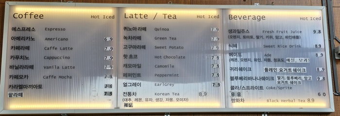 ✅퀴노아라떼, 녹차라떼, 고구마라떼, 핫초코, 캐모마일, 페퍼민트, 얼그레이, 전통차(대추,레몬,유자,생강,자몽,오미자,매실)