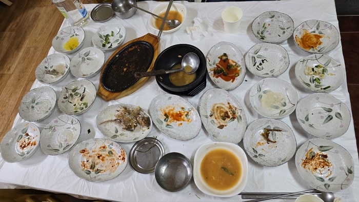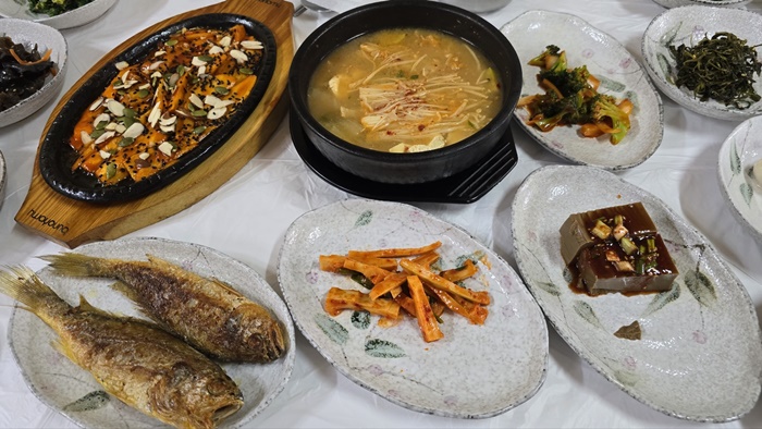 산나물 밥상의 기본찬은 주문한 메뉴에ㅠ 따라 달라지는데 위의 기본찬은 더덕구이 밥상의 기본찬임을 알려드리며 가짓수는 24종이나 되어 일일이 나열하기가 쉽지가 않네요. 제가 보기에는 모든 찬들이 건강식이네요. 대표적인 메뉴 몇 가지 적어 볼게요. 더덕구이니까 더덕구이, 조기구이, 죽순, 된장찌개, 도토리묵, 브로콜리, 토란, 톳무침, 궁채............ 등등