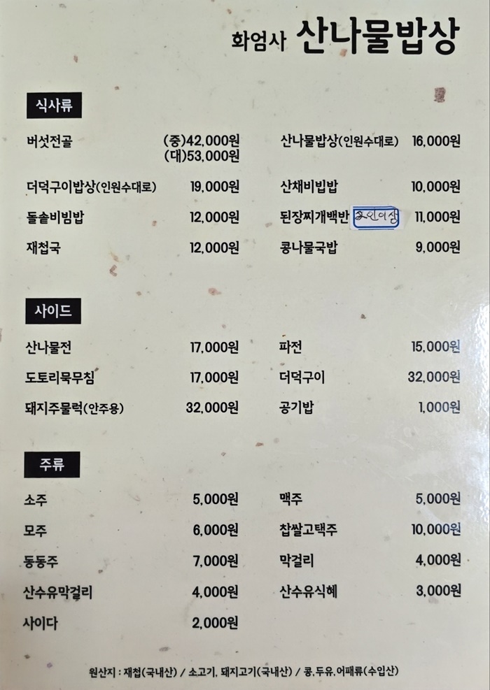 ✅식사류: 버섯전골(中) 42,000(大) 53,000, 더덕구이밥상 19,000, 돌솥비빔밥 12,000, 산채비빔밥 10,000, 콩나물국밥 9,000, 재첩국 12,000, 산나물밥상 16,000, 된장찌개백반 11,000 이 있네요.