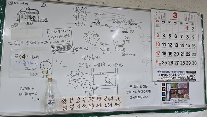 입맛에 잘 맞아 깔끔하게 먹고 보니 포장도 가능하다고 붙어 있고 보드판에는 웬 낙서를 이리 해 놨나 하고 보니 손님들이 물어볼 수 있는 문제들의 답을 적어 놓은 답안지였습니다. 안 드실 반찬은 한쪽으로 놓아달라는 주문과 추가 반찬은 먹은 접시를 갖고 주방으로 가서 채워 오고 물은 숭늉은 없고 냉장고 아래 물이 있으니 셀프라고 적오 놓은 듯해요. 오후 4시에서 5시는 저녁 준비시간이랍니다.