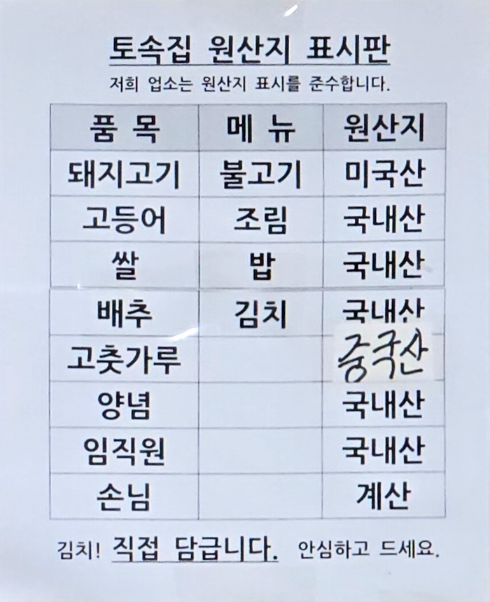 입맛에 잘 맞아 깔끔하게 먹고 보니 포장도 가능하다고 붙어 있고 보드판에는 웬 낙서를 이리 해 놨나 하고 보니 손님들이 물어볼 수 있는 문제들의 답을 적어 놓은 답안지였습니다. 안 드실 반찬은 한쪽으로 놓아달라는 주문과 추가 반찬은 먹은 접시를 갖고 주방으로 가서 채워 오고 물은 숭늉은 없고 냉장고 아래 물이 있으니 셀프라고 적오 놓은 듯해요. 오후 4시에서 5시는 저녁 준비시간이랍니다.