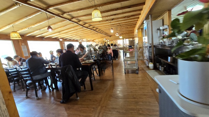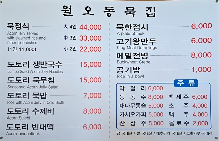 월오동 묵집은 넓은 주차장에 주차를 하고 때에 따라서는 대기를 해야 할 때가 있다. 대기는 밖의 의자에서 대기를 해야 하는데 순서가 되면 이름을 불러 줍니다. 호명이 되면 신발을 벗고 안느로 들어가 지정해 주는 테이블로 가서 주문을 합니다.