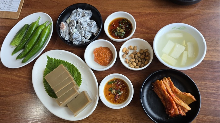 ✅묵정식에 나오는 기번찬들입니다. 토토리빈대떡, 도토리쟁반국수, 도토리묵밥, 도토리수제비, 도토리묵무침, 도토리묵샐러드, 콩볶음, 양념간장 2종류, 배추김치, 청양고추, 쌈장, 물김치가 나오는데 모두가 맛났네요. 특히 도토리샐러드가 제 입맛에 잘 맞더라고요.