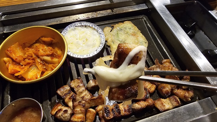 ✅불위에 올라가는 찬: 볶은 김치, 양념소스, 치즈.