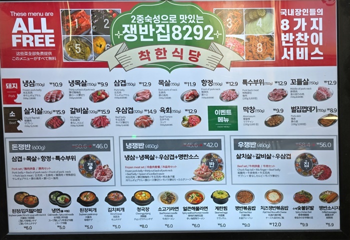 🍀쟁반집 8292 메뉴판입니다.