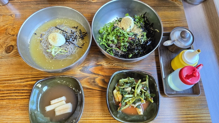 ✅ 물 막국수 9,000원 : 메밀가루로 만든 면발에 시원한 육수와 다양한 찬이 함께 제공됩니다.