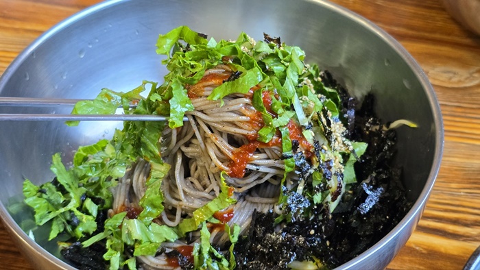 ✅매운 음식을 좋아하지 않는다면 비빔 막국수를 주문할 때 "덜 맵게 해 주세요"혹은 " 아주 맵게 해 주세요"라고 요청하세요.