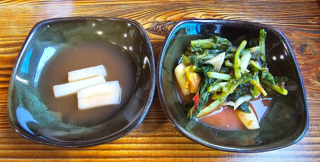 ✅동원 막국수집의 기본찬은 열무김치와 무김치 두 가지이며 만두를 시키면 영념간장이 나옵니다.