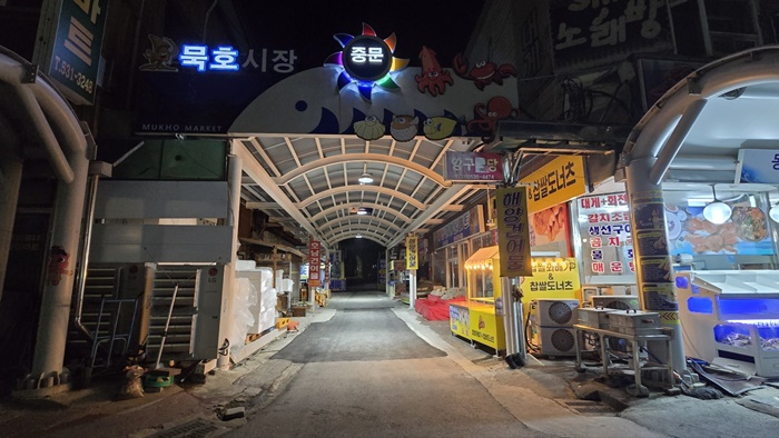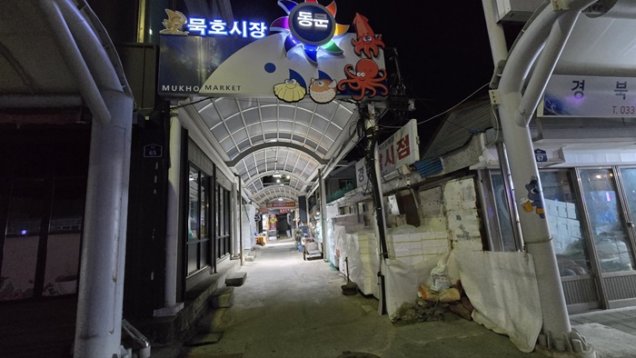 여행에서 가끔은 지역의 특성을 잘 몰라 곤란을 겪는 경우가 종종 있었는데 서울이나 대도시를 다닐 때는 그렇지 않은데 지방 소도시를 다니다 보면 식당이나 가게들이 일찍 문 닫는 경우를 종종 봤기 때문에 이곳 동해에서도 행여 그렇게 될까 봐 노심초사하면서 다니는데 불길한 예감도 들기도 한다. 준비한 재료가 모두 소진되었습니다라는 문구가 보이고 주변이 점점 어두워지고 있으니 어쩐다 하고 묵호시장 쪽으로 발길을 돌리는데 혹시 이곳도 그럴까 하는데 마침 밝은 빛이 있어서 다행이었다.