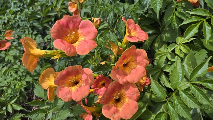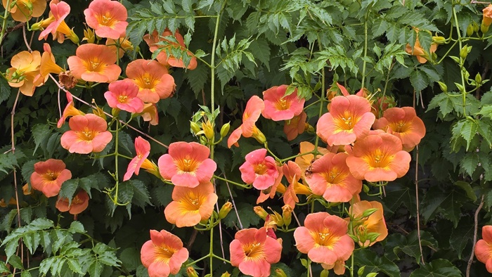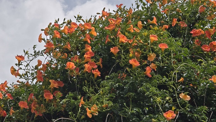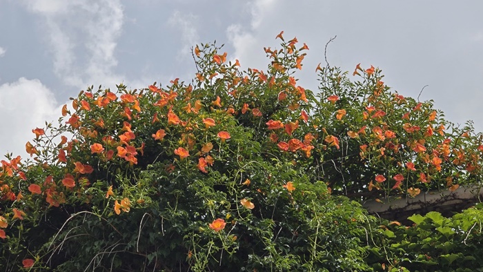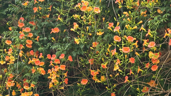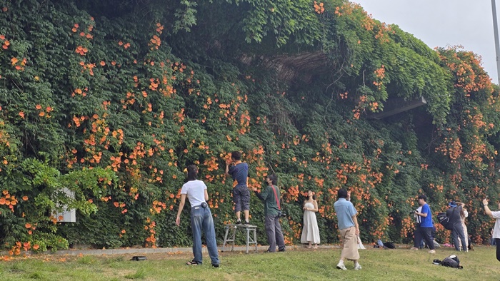 ✅뚝섬유원지의 서쪽 강변에는 수백 미터 길이의 담벼락이 있으며, 여기에 능소화 덩굴이 빽빽하게 퍼져 있어 여름철에는 주황색 꽃들이 만발하여 장관을 이루고 있습니다.