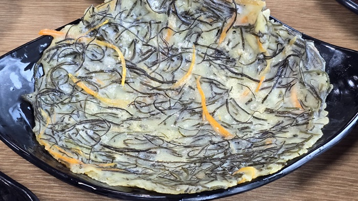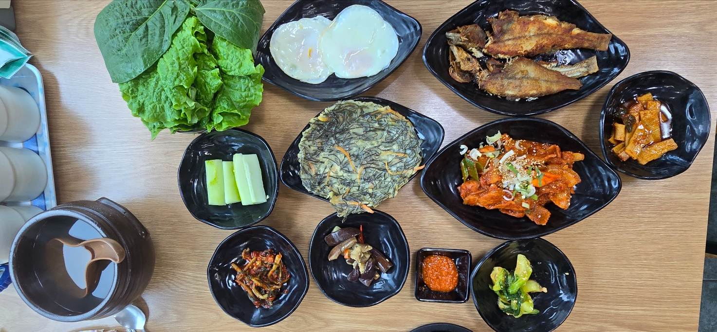 제주 모녀식당의 기본찬은 모녀정식을 주문한 경우 이렇게 나오는데 제가 좋아하는 것을 먼저 찍어보았어요. 일단은 주문을 하면 뚝배기에 그리 뜨겁지 않고 마시기 좋을 만큼의 온도에 있는 숭늉이 나오고 자시후면 기본 찬들이 나오게 되더라고요. 제육볶음, 톳빈대떡, 가자미튀김, 가지무침, 어묵볶음, 청경채볶음, 열무김치, 오이와 쌈장, 상추와 콩잎, 계란프라이로 한상 가득 차려졌어요. 와 ~ 대박