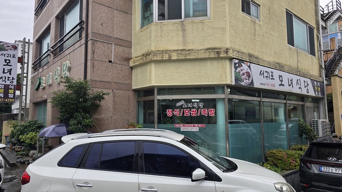 이른 새벽 김포공항으로 길을 나서며 밥때를 놓친 시간이라 감각이 있는 건지 모르고 비행기에 몸을 싣고 제주 공항에 도착하니 8시 30분경 되어 밖으로 나가 렌터카대여 함과 동시에 아침거리를 걱정하다 sns로 검색을 하니 이곳 서귀포모녀식당이 눈에 들어왔는데 맛나다, 그저 그렇다는 등 반응이 엇갈려 사람마다 입맛이 다른데 사진으로 봐서는 괜찮을 듯 싶어 찾아갔는데 주택가라 주차공안이 여유롭지가 않아 남의 집 주차장에 살짝 실례를 하고 식당으로 갔네요.