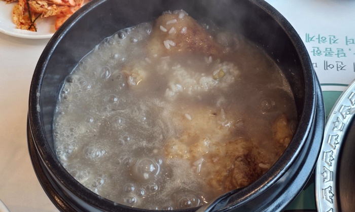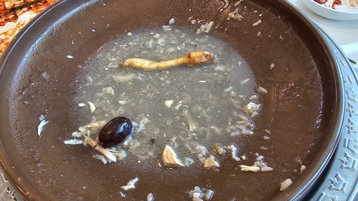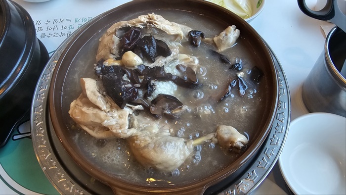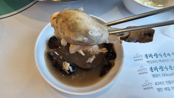 👉누룽지 닭백숙: 본가 장수촌의 대표 메뉴로써 부드럽고 쫄깃한 닭고기와 깊은 국물 맛, 그리고 누룽지의 향긋함이 조화를 이루는 독특한 닭백숙으로 가격은 50,000원입니다.
