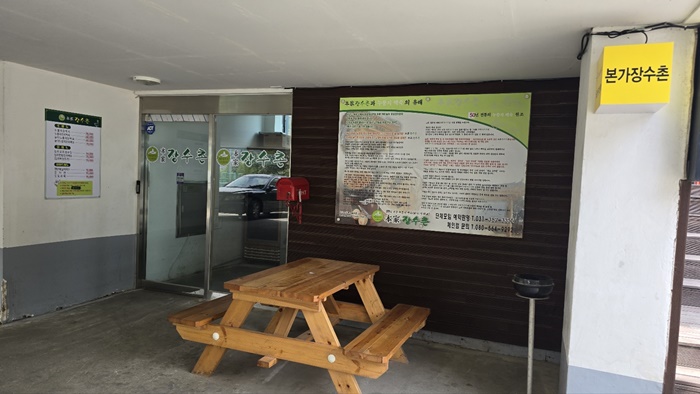 뜨거운 여름 보양식을 먹고 한여름 삼복더위를 견디기 위해 찾는 것이 보통 삼계탕이나 장어 그리고 취향에 따라 드시는 것이 다른데 저는 닭을 좋아해서 볼일을 보러 안양에 갔다가 지인의 소개로 찾아간 곳이 바로 본가장수촌이었습니다. 이른 점심시간이라 망설이다가 그래도 좋아서 그냥 가서 먹기로 하고 찾아갔네요. 건물은 2층짜리인데 1층은 주차장으로 쓰고 식당은 2층에 있네요.