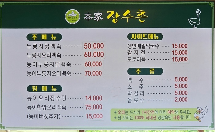 👉누룽지 닭백숙: 본가 장수촌의 대표 메뉴로써 부드럽고 쫄깃한 닭고기와 깊은 국물 맛, 그리고 누룽지의 향긋함이 조화를 이루는 독특한 닭백숙으로 가격은 50,000원입니다.