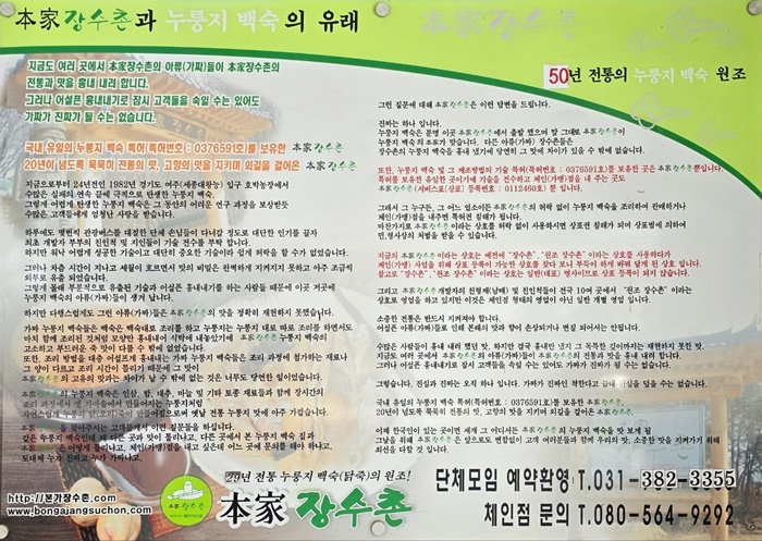 ✅본가 장수촌은 30년 이상의 오랜 역사를 자랑하는 닭백숙 전문 체인점으로, '누룽지 닭백숙'이라는 독보적인 메뉴와 뛰어난 맛과 건강, 그리고 끊임없는 노력으로 많은 사랑을 받고 있습니다.