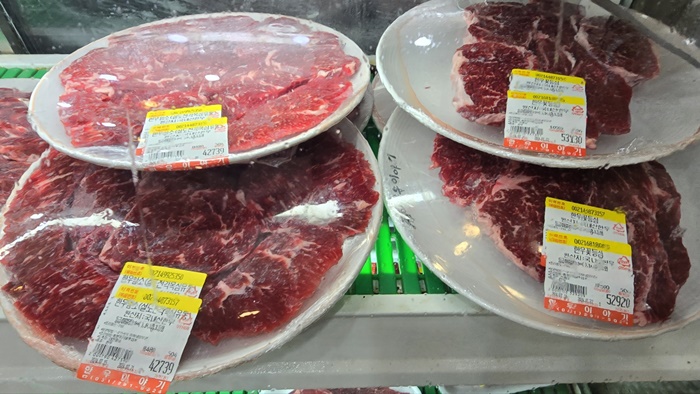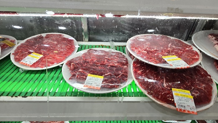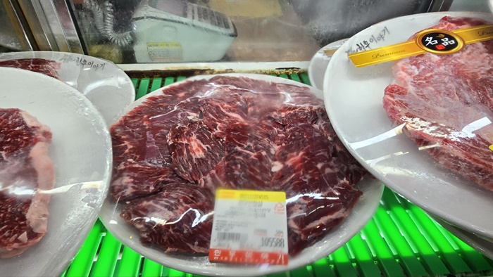 👉한우등심, 한우암소 한 마리, 한우꽃등심, 한우안심, 이야기 스페셜, 명품스페셜, 한우차돌박이 :정육 냉장고에 포장된 고기에 가격표가  부쳐 있습니다.