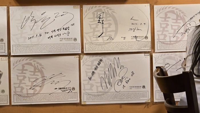 ✅이천영양돌솥밥집의 한쪽 벽면을 장식하고 있는 많은 싸인으로 봐서 많은 연예인들 사이에서도 자주 찾는 맛집인 듯합니다.