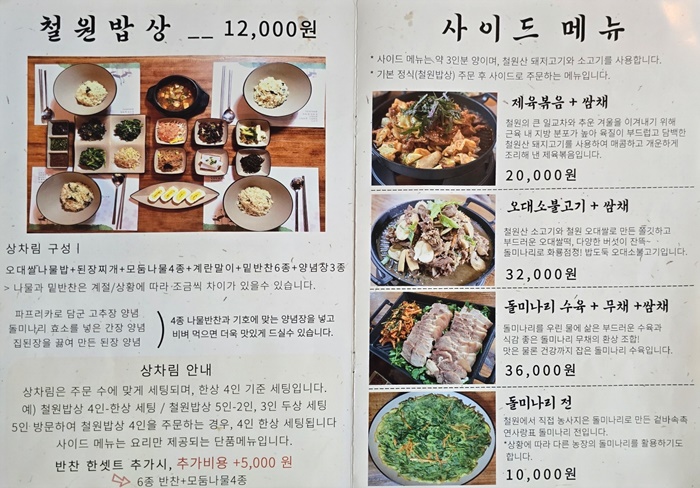 ✅다양한 메뉴: 철원 밥상, 사이드메뉴 등 다양한 메뉴가 준비되어 있어 취향에 맞게 선택할 수 있습니다.