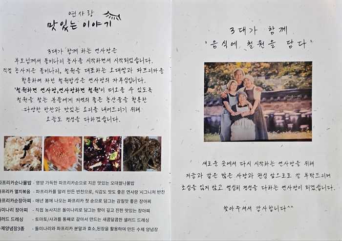 ✅연(蓮) 사랑: 이어갈 연(連) 자는, 철원의 자연과 사람들을 이어주고, 음식을 통해 사람과 사람 사이의 정을 이어주고자 하는 바람을 담고 있을 수 있습니다. 사랑: 고객을 향한 진심 어린 사랑과 정성을 담아 음식을 만들고 서비스한다는 의미를 내포합니다.
