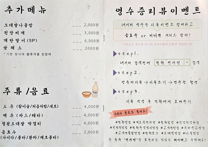 👉오대쌀: 철원 오대쌀은 깨끗한 물과 비옥한 토양에서 자란 쌀로, 밥맛이 좋고 찰기가 강해 찰밥이나 숭늉으로 즐기기에 좋습니다. 연사랑에서는 철원 오대쌀로 지은 밥을 제공하며, 구매도 가능할 수 있습니다.