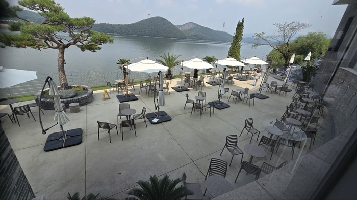 ✅층고가 높고 통유리창이 많아 시원하고 쾌적한 분위기를 느낄 수 있고 바로 앞 이동저수지를 바라보며 여유로운 시간을 보낼 수 있는 곳입니다. 특히 날씨가 좋은 날에는 야외에서 호수를 배경으로 사진을 찍는 것도 좋습니다.