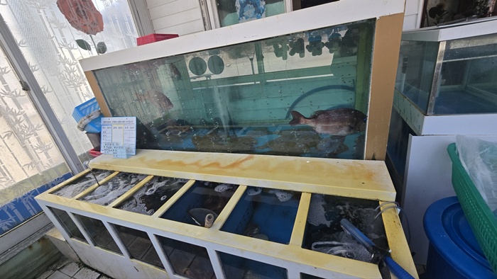 👉수족관: 신선한 해산물을 바로 확인할 수 있는 큰 수족관이 준비되어 있습니다.