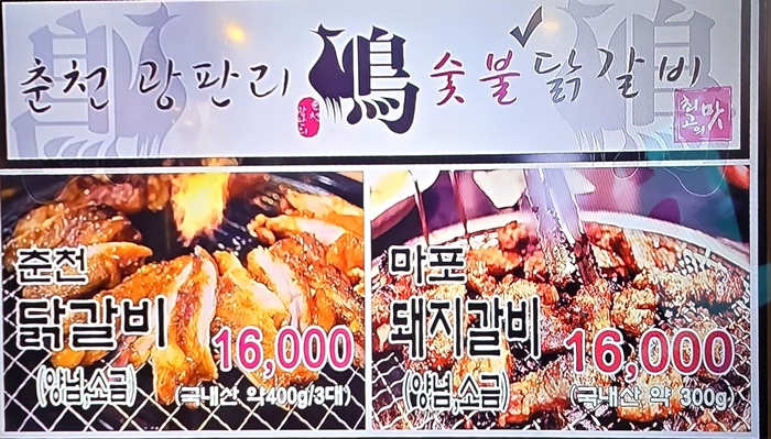 ✅메인 메뉴: 숯불 닭갈비 (양념, 소금), 마포 돼지갈비 (양념, 소금) 닭갈비는 1인분에 3대 (약 400g) 제공됩니다. 돼지갈비는 1인분에 300g 제공됩니다.