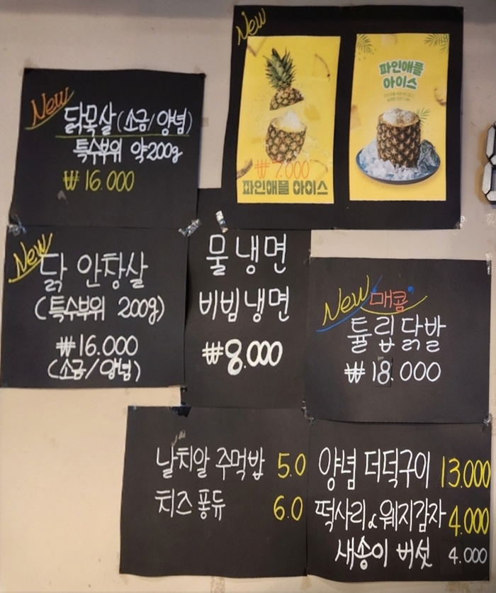 ✅다양한 사이드 메뉴: 닭목살, 닭안창살, 닭발 등 특수 부위, 양념 더덕구이, 콩국수 (여름 메뉴), 열무국수 (여름 메뉴), 물냉면, 비빔냉면, 날치알 주먹밥, 계란찜 등이 있습니다.