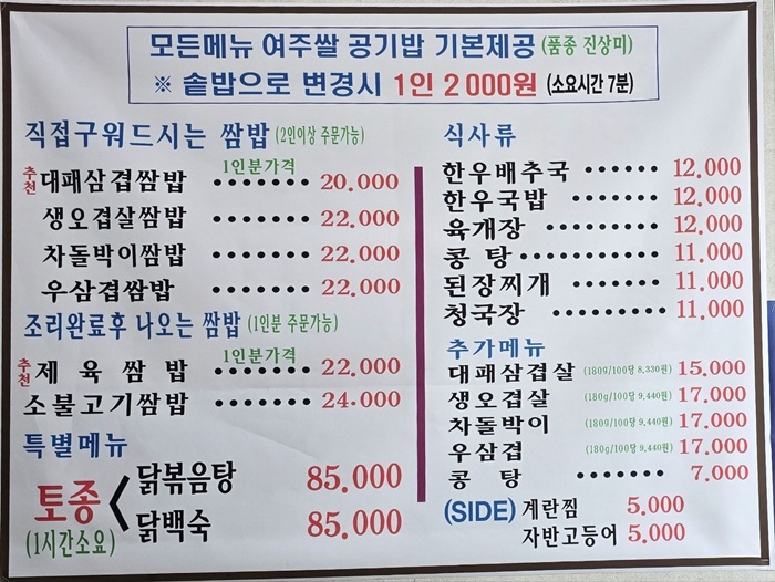 ✅추가 메뉴: 계란찜 (5,000원), 자반고등어 (5,000원) 보양식: 토종닭백숙/볶음탕 (85,000원) (1시간 전 예약 필수)