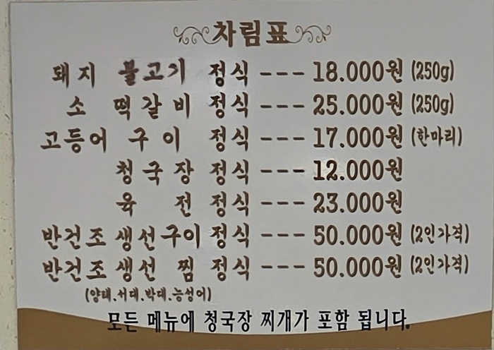 👉반건조 생선구이 / 생선찜 정식(50,000원 2인가격): 비교적 고가이지만, 푸짐하게 생선 요리를 즐기고 싶을 때 선택합니다.