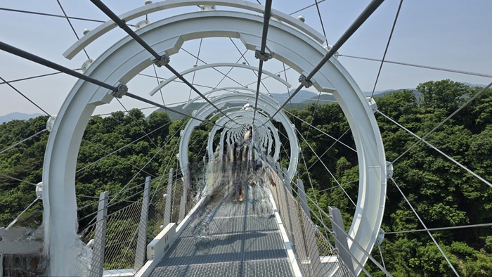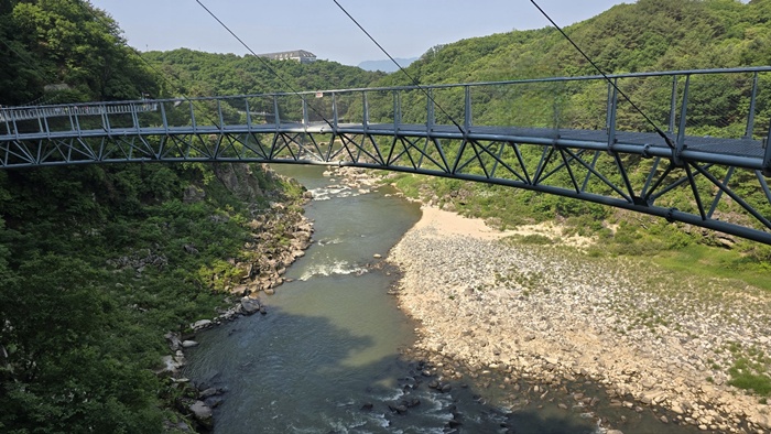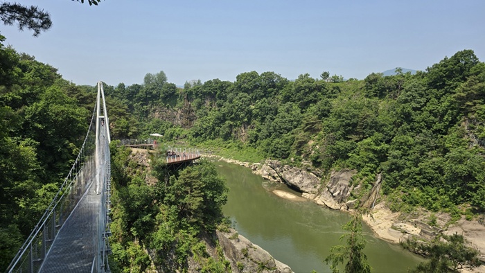 👉절벽 위를 걷는 듯한 경험: 길 대부분이 강물 위 또는 절벽 중간에 설치된 잔도(데크길, 다리)로 되어 있어, 마치 강 위를 걷거나 절벽에 매달려 걷는 듯한 짜릿한 스릴을 느낄 수 있습니다. 특히 투명 유리 구간이나 흔들 다리 구간은 더욱 흥미를 더합니다.